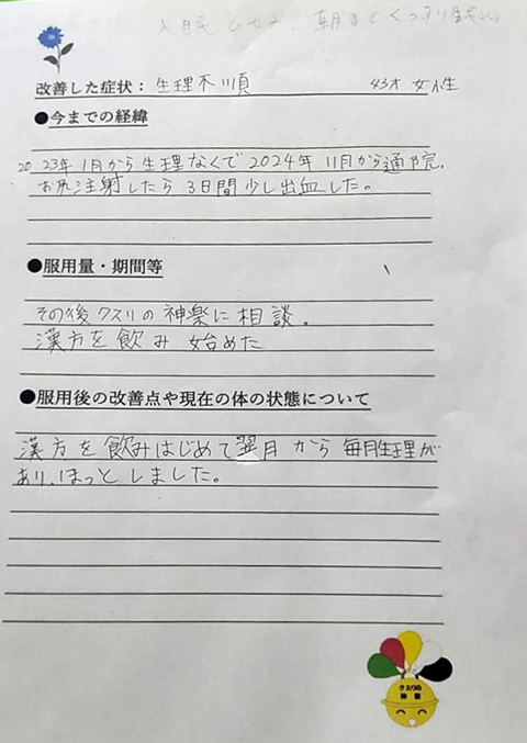 改善した症状:生理不順 今までの経緯: 2023年1月から生理が無くて2024年11月から通院。 お尻注射したら3日間少し出血した。 服用量・期間等: その後、クスリの神楽に相談。 漢方を飲み始めた。 服用後の改善点や現在の体の状態について: 漢方を飲み始めて翌月から毎月生理があり、ホッとしました。