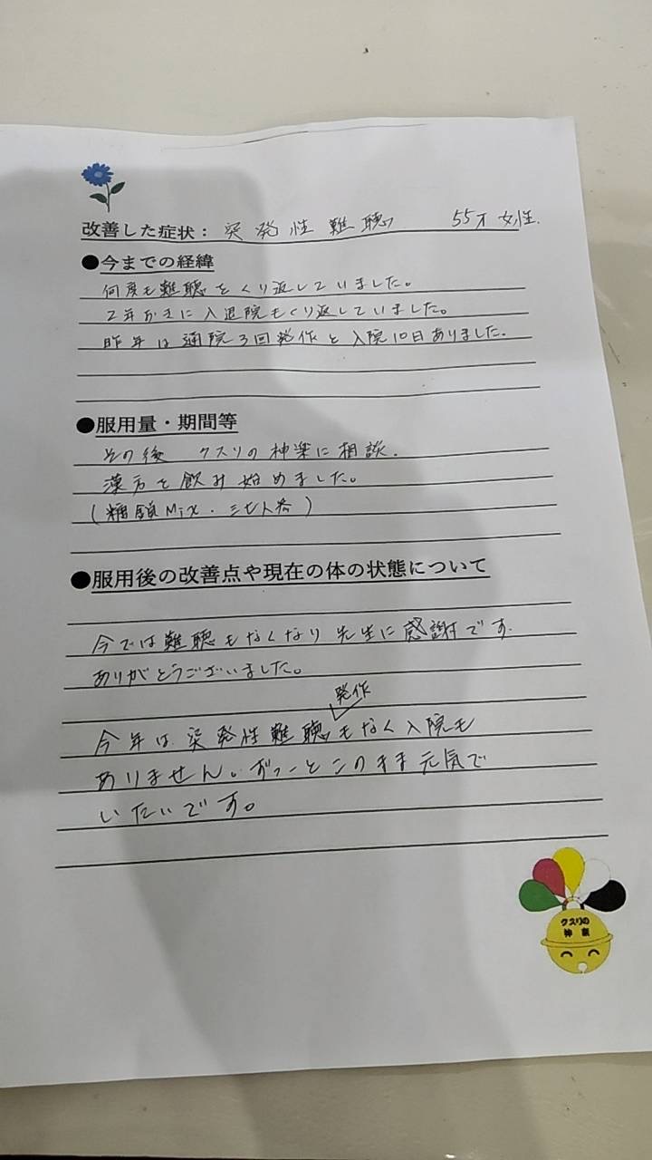 おうえんたいコーナー体験談 突発性難聴 体験談 2025.10.08 改善した症状:突発性難聴(55才 女性) 今までの経緯: 何度も難聴をくり返していました。 2年おきに入退院もくり返していました。 昨年は通院3回発作と入院10日ありました。 服用量・期間等: その後、クスリの神楽に相談。 漢方を飲み始めた。 (糖鎖Mix、三七人参) 服用後の改善点や現在の体の状態について: 今では難聴もなくなり先生に感謝です。 ありがとうございました。 今年は突発性難聴発作もなく入院もありません。 ずっとこのまま元気でいたいです。