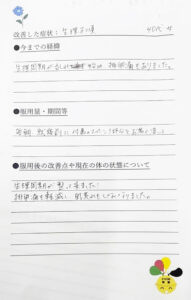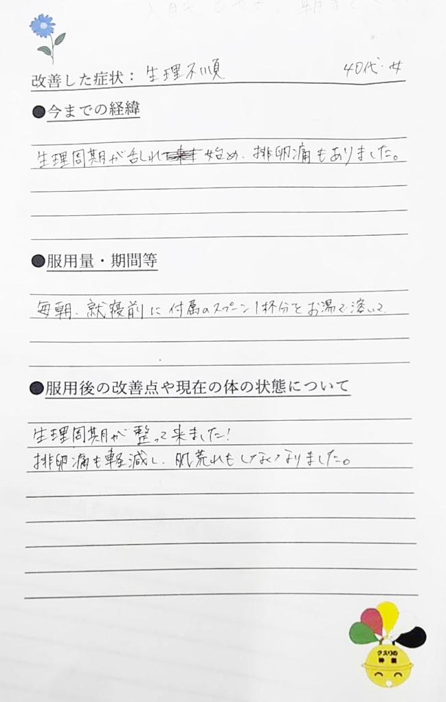 おうえんたいコーナー体験談 生理不順 体験談 2025.12.20 改善した症状:生理不順(40代 女性) 今までの経緯: 生理周期が乱れ始め、排卵痛もありました。 服用量・期間等: 毎朝、就寝前に付属のスプーン1杯分をお湯で溶いて。 服用後の改善点や現在の体の状態について: 生理周期が整って来ました! 排卵痛も軽減し、肌荒れもなくなりました。 この方は漢方薬を飲み始めて約半年になります! 子育てとお仕事の両立。 お元気でご活躍。