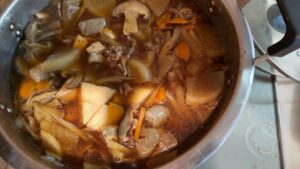 いつもの鍋に材料を切って入れましたら、途中で入り切れず、三十人鍋に移して煮込みました!